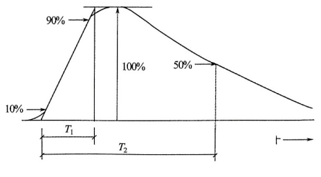 如下圖所示,先由縱軸滿刻度的10%、90%和100%做三條平行于橫軸的直線,前兩條平行線與波形曲線的頭部兩個交點(diǎn)做一條直線,該直線與第三條平行線和橫軸分別相交于兩點(diǎn),波頭時間用T?表示。為了定義波長時間,再由縱軸上50%刻度做橫軸的平行線,該平行線與波尾部分相交,由交點(diǎn)向下引垂線與橫軸相交,得到波長時間,用T?表示。由于波長時間也是波形曲線衰減到半幅值所需要的時間,它習(xí)慣上也被稱為半幅值時間。在定義了波頭和波長時間后,單極性雷電流脈沖波形可計(jì)為T?/T?,這里T?和T?一般采用μs作為單位。雷電波形在工程上有重要的應(yīng)用,諸如試驗(yàn)室的雷電模擬、工程計(jì)算等。