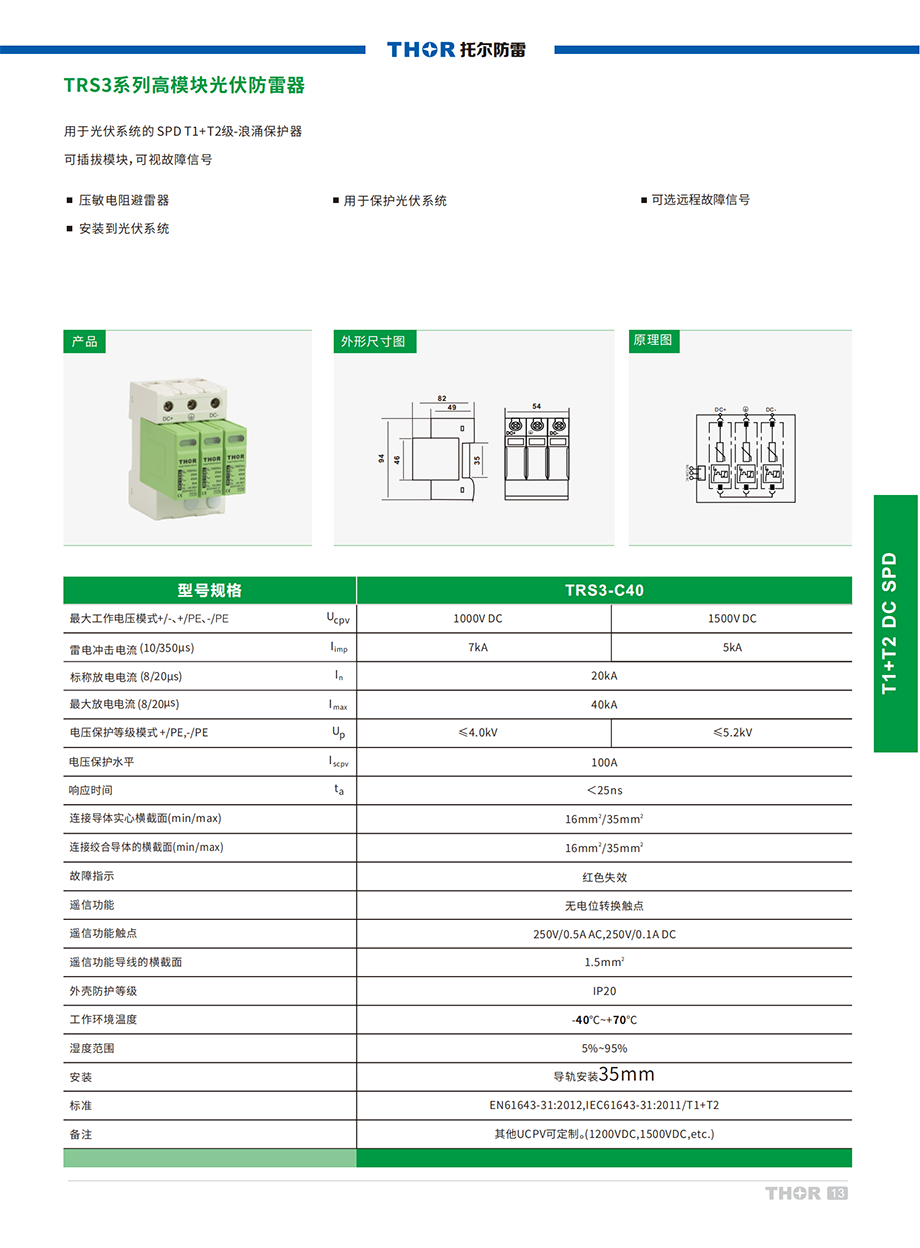 TRS3系列電涌保護(hù)器適用于新能源太陽能光伏發(fā)電系統(tǒng)或其他直流電源系統(tǒng)的防雷保護(hù),最大持續(xù)工作電壓DC500V、800V、1000V。安裝位置在直流電路總電源系統(tǒng)中,對間接雷電流、直接雷電流或其它瞬間過電壓進(jìn)行保護(hù)。