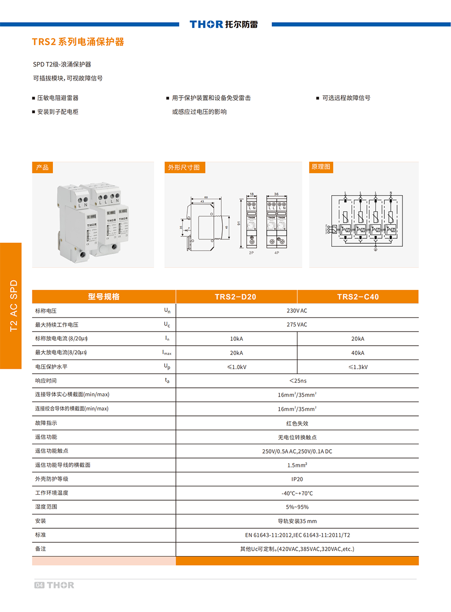 TRS2系列電涌保護(hù)器(以下簡稱SPD)適用于交流50/60Hz,額定電壓至380V的IT、TT、TN-C、 TN-S、TN-C-S,等供電系統(tǒng),對間接雷電和直接雷電影響或其他瞬時過電壓的電涌進(jìn)行保護(hù)。