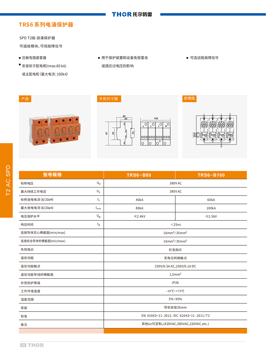 TRS6系列電涌保護(hù)器(以下簡(jiǎn)稱(chēng)SPD)適用于交流50/60Hz,額定電壓至380V的IT、TT、TN-C、 TN-S、TN-C-S,等供電系統(tǒng),對(duì)間接雷電和直接雷電影響或其他瞬時(shí)過(guò)電壓的電涌進(jìn)行保護(hù)。